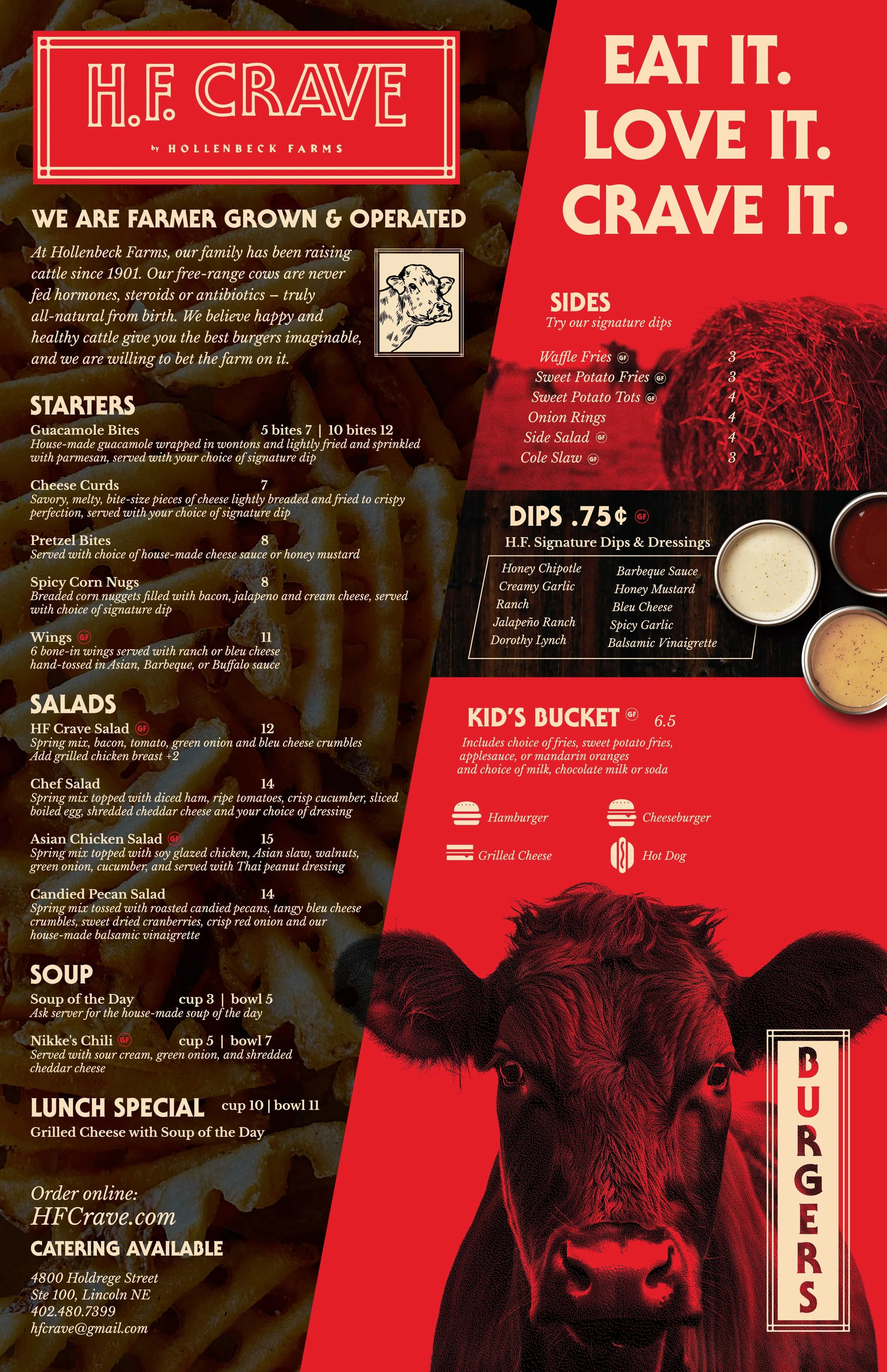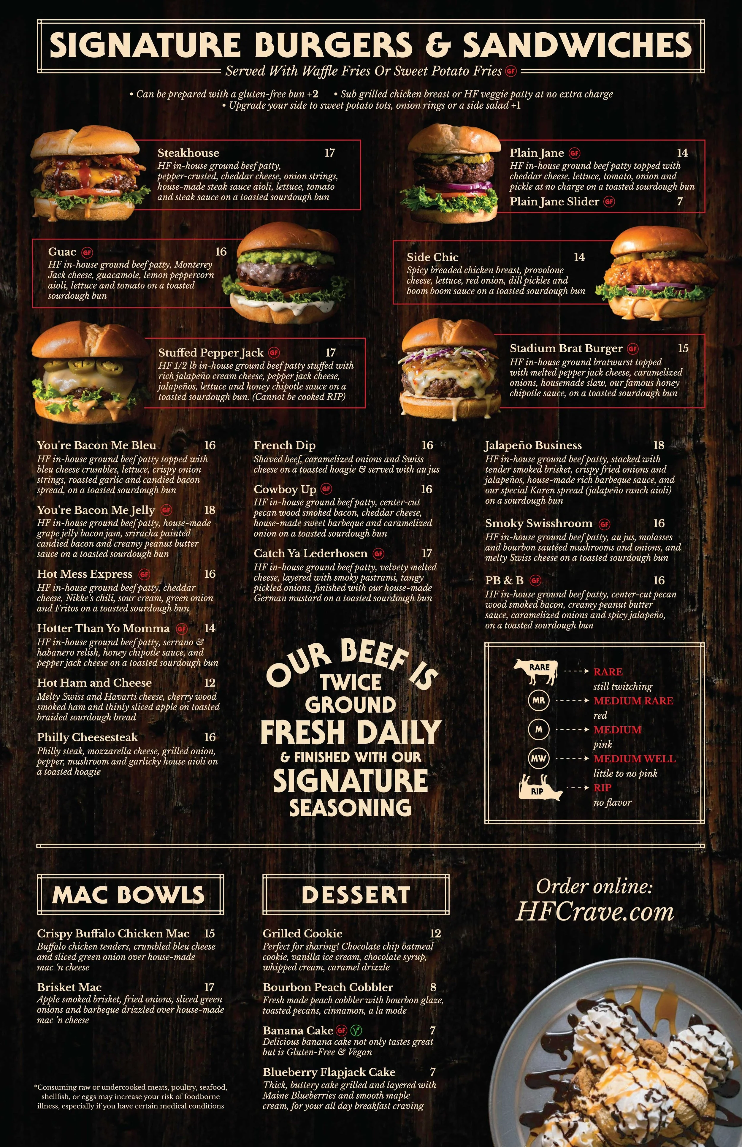 Our starters, salads and sides serve as the perfect intro to your meal, or as delicious standalone snacks. Looking for comfort food? Try our guacamole bites, cheese curds or chicken wings. Sticking to the lighter side? You can’t go wrong with the H.F. Crave salad and signature dressing!